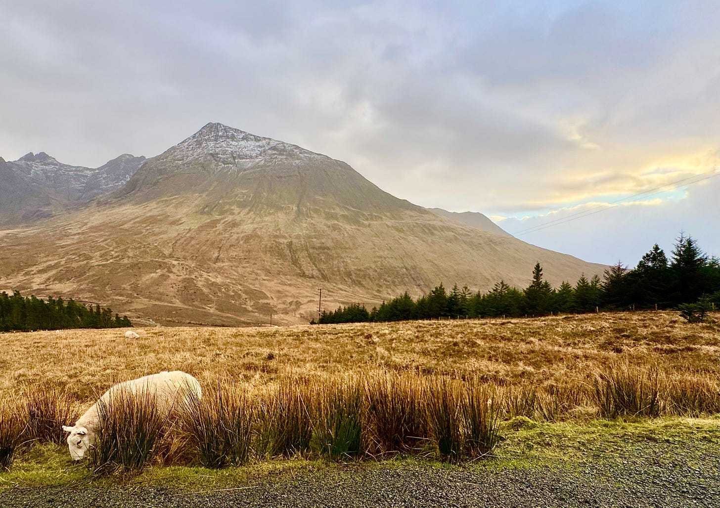 A grazing sheep in front of the Cuillin Mountains on the Isle of Skye, December 2024.